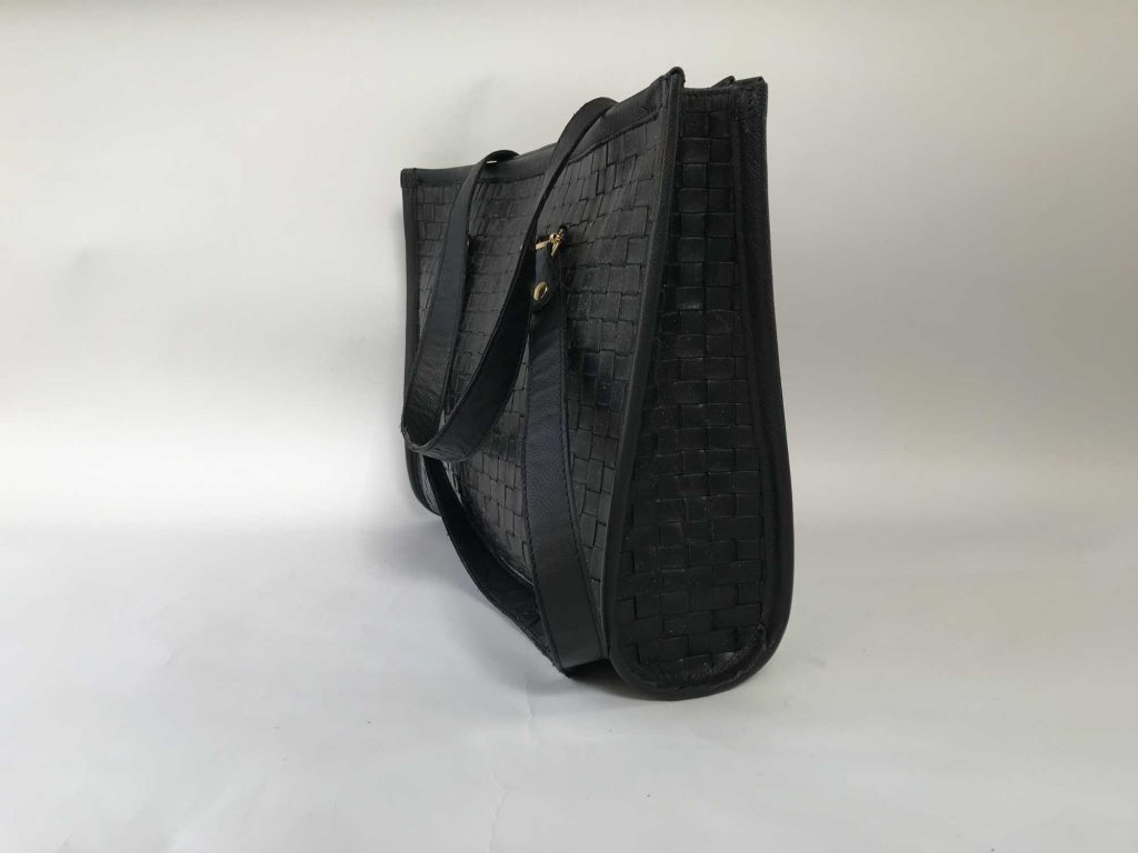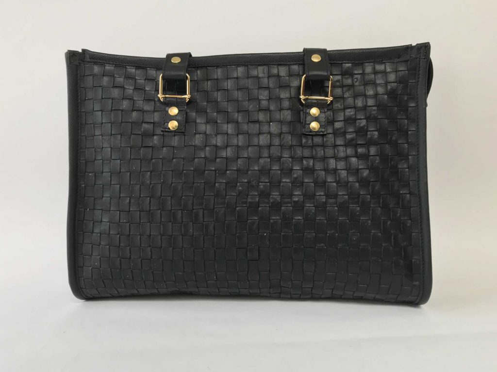 LuPéLo schoudertas, gemaakt van gerecycled Italiaans leer in een vlechtprint. De tas sluit met een rits en is gevoerd met grijze canvas en heeft een ritsopbergvak. De tas heeft goudkleurig beslag en rits.