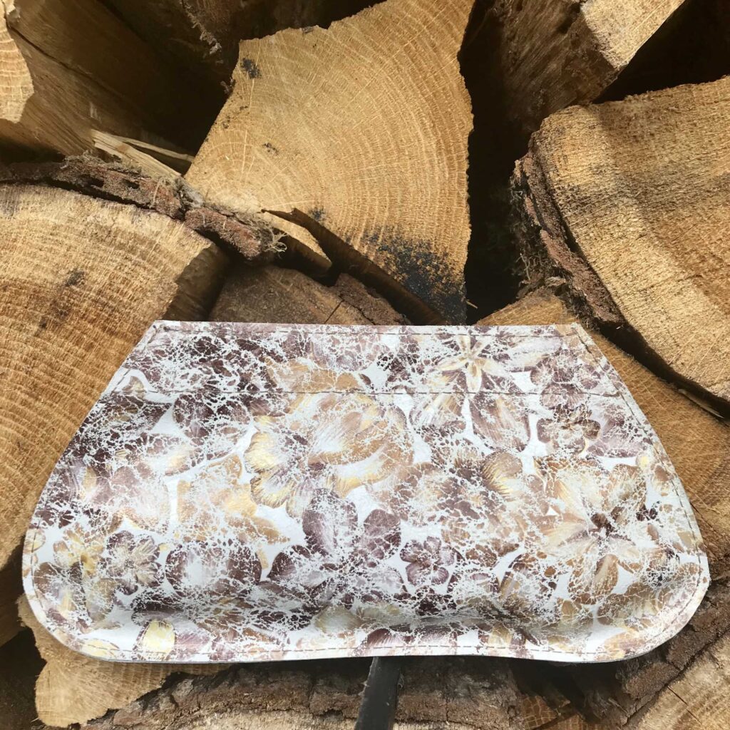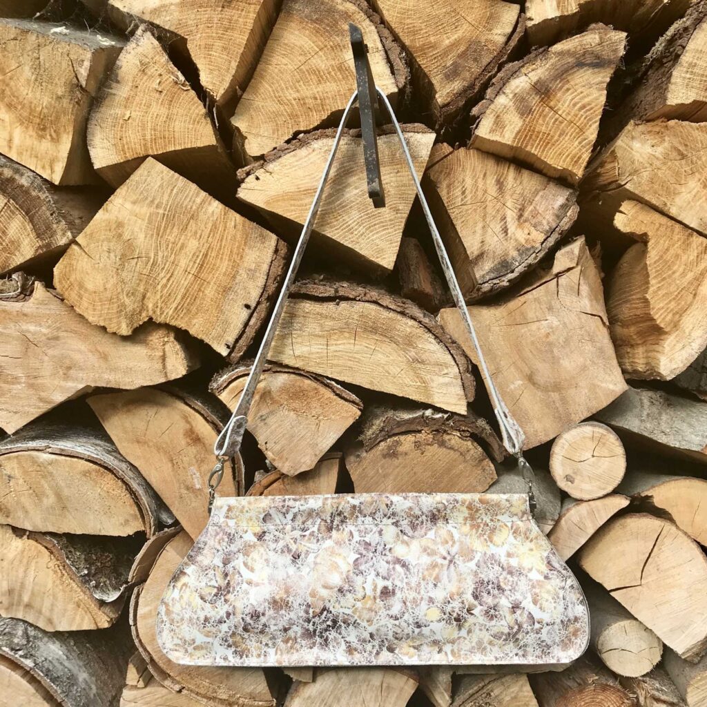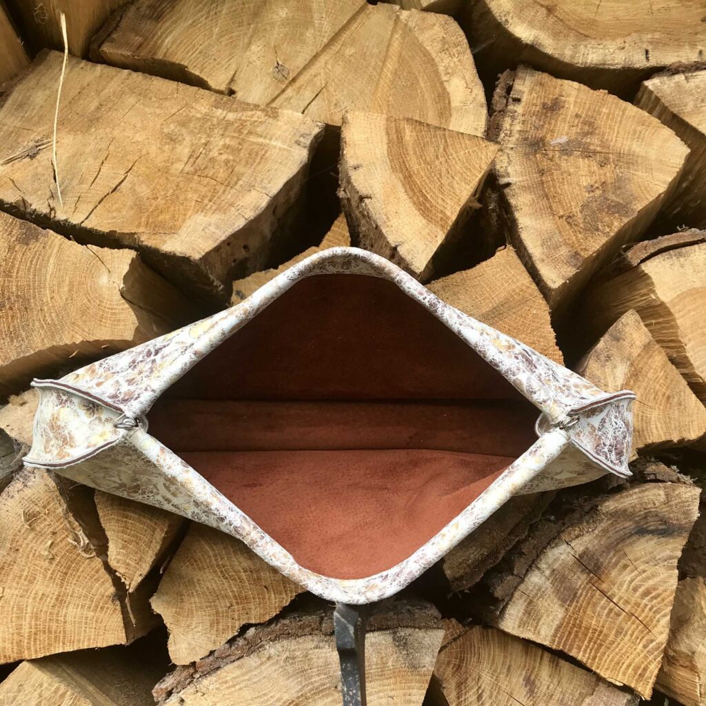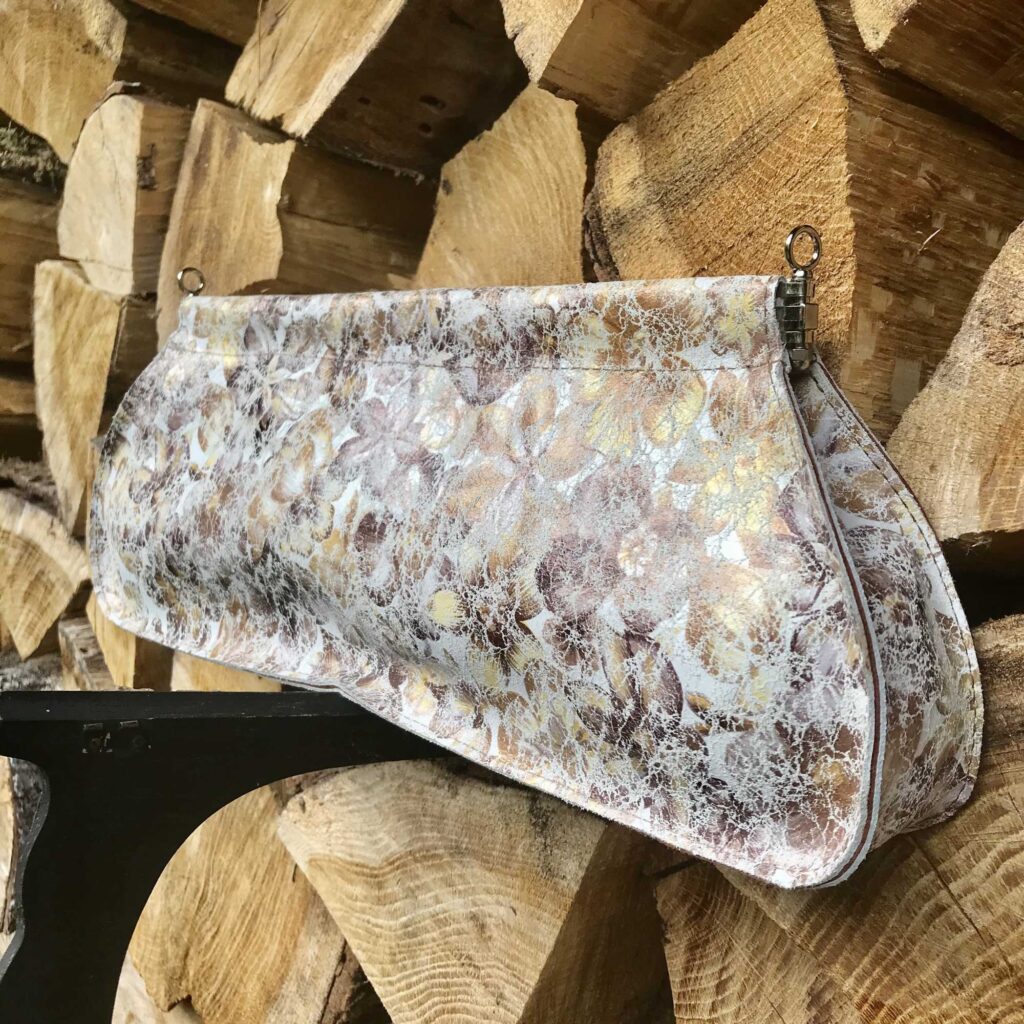 LuPéLo clutch/schoudertas in leer met een print. Deze schoudertas is gevoerd met leer, heeft een afneembare schouderband zodat er een clutch van te maken is. De tas draagt een klein clutchje in zich en sluit met een veersluiting.