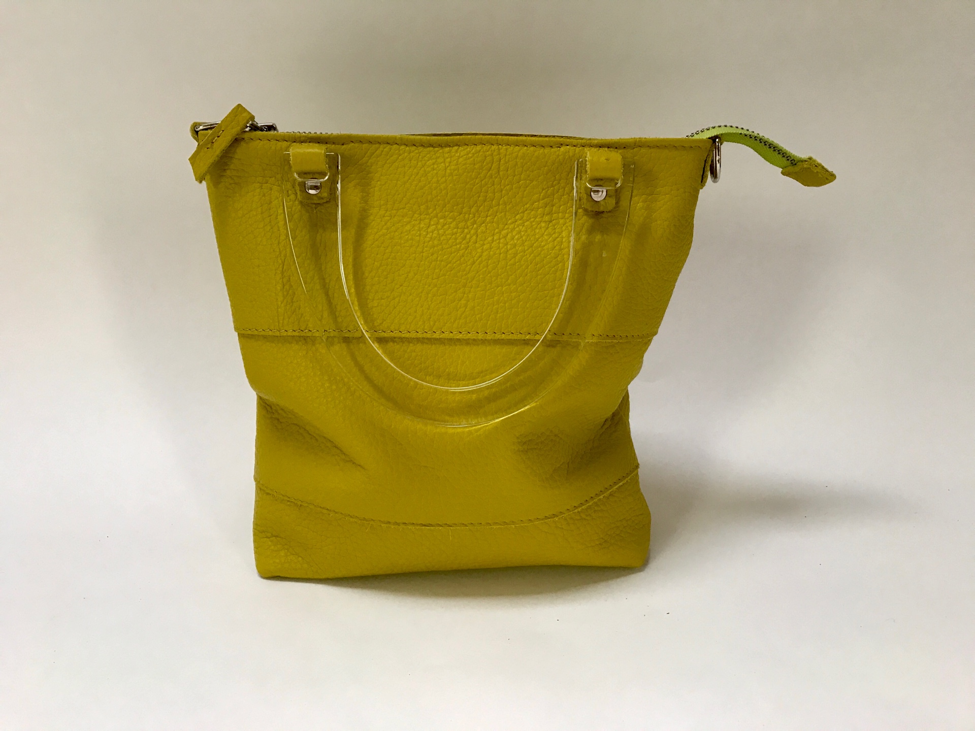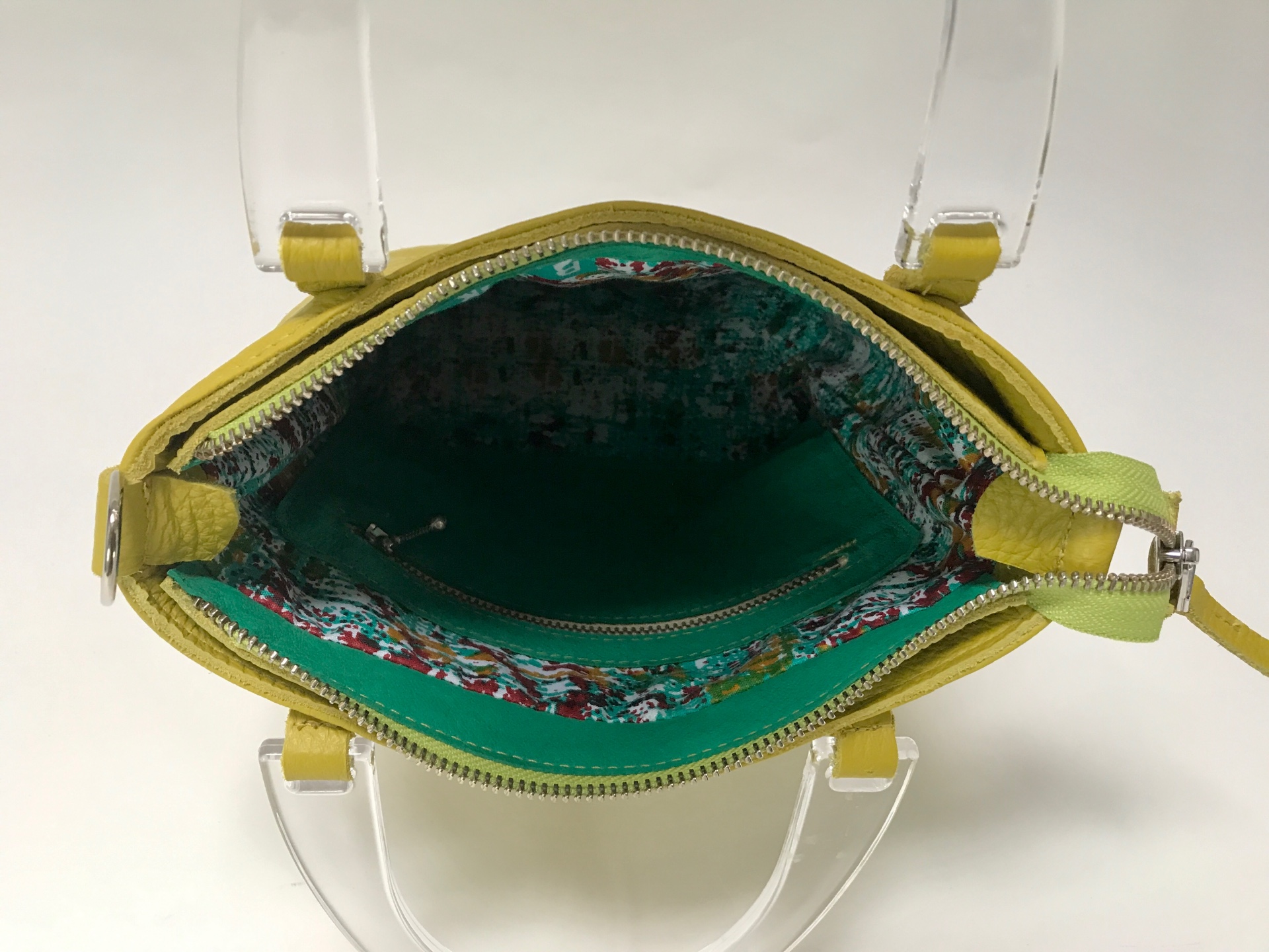 LuPéLo schoudertasje, gemaakt van de leren stalen uit de design meubelzaak. Het limoenkleurige leer combineerde ik met een katoenen Woodin stof, die ik kocht tijdens één van mijn PUM missies in Kumasi (Ghana). De tas sluit met een rits, heeft acryl handvatten en een kleurige (afneembare) schouderband).