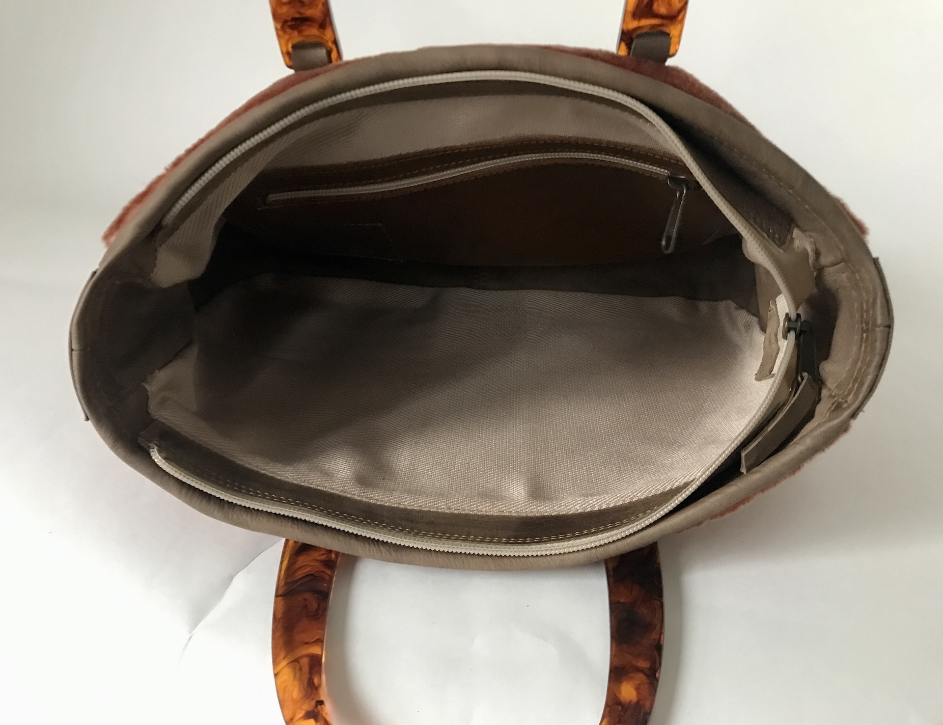 LuPéLo handtas, gemaakt van een prachtige kleur schapenvacht in combinatie van bijpassend zandkleurig leer. De tas is gevoerd met zandkleurige tassenvoering en leer en is voorzien van een leren ritsopbergvak. De tas heeft 2 bruine acryl handvatten.