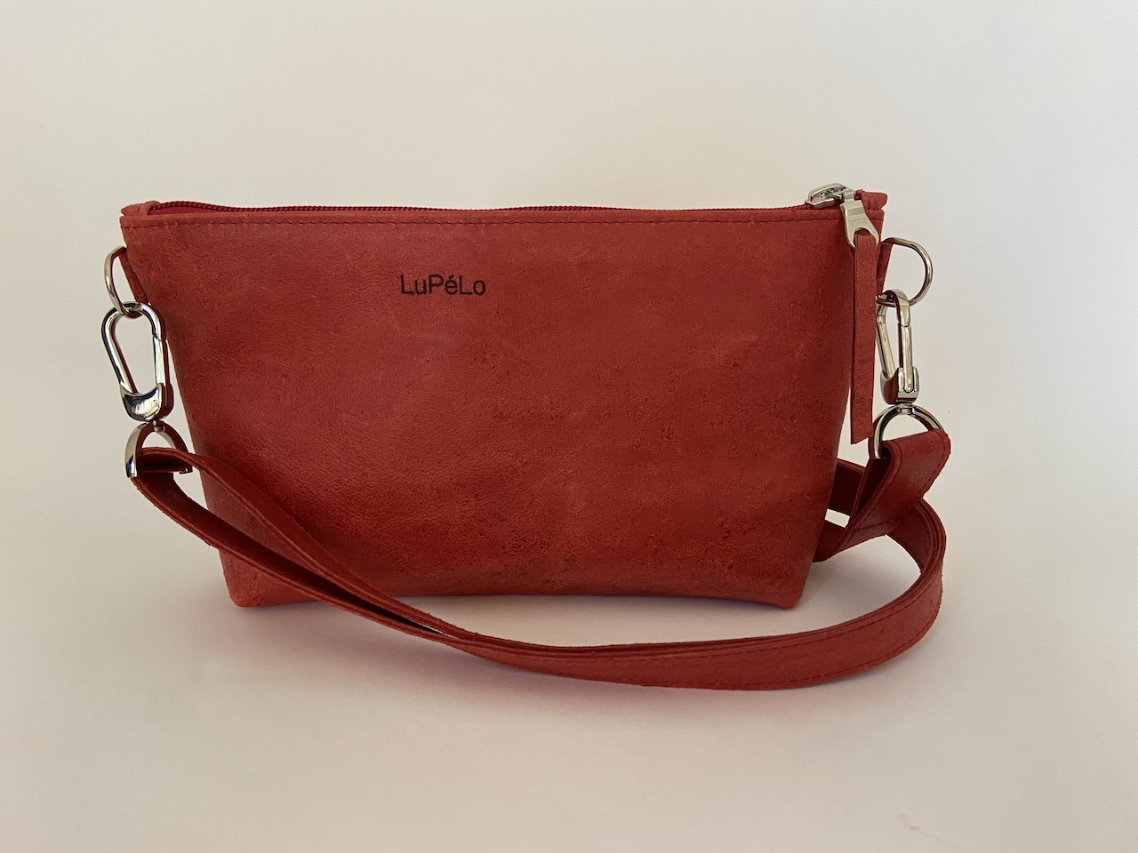 LuPéLo schoudertasje, gemaakt van de achterkant van een leren stoel en voorzien van bijpassende ‘dotjes’ die ik stanste uit een leerstaal. De tas heeft een ritsvak voorop en is gevoerd met een passende “de Ploeg” stofje. De schouderband is op lengte in te stellen en is 2,5 cm. breed.