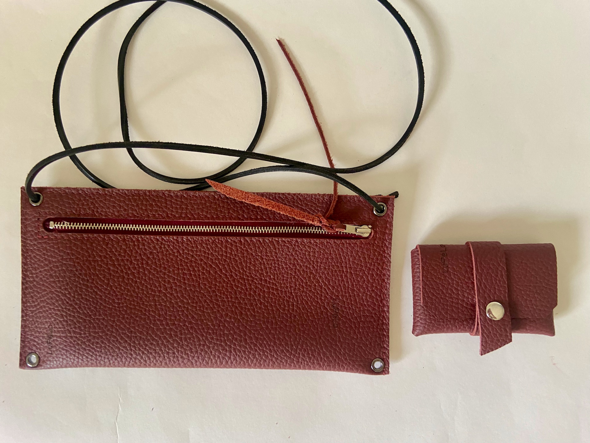 LuPéLo telefoon/stadstasje, gemaakt van een leren Leolux staal in een mooie donkerrode kleur. De tas sluit met een rits en heeft 2 ‘draag’mogelijkheden, overdwars of overlangs en draagt een pasjesmonnaies in zich. De rits meet 20 cm.