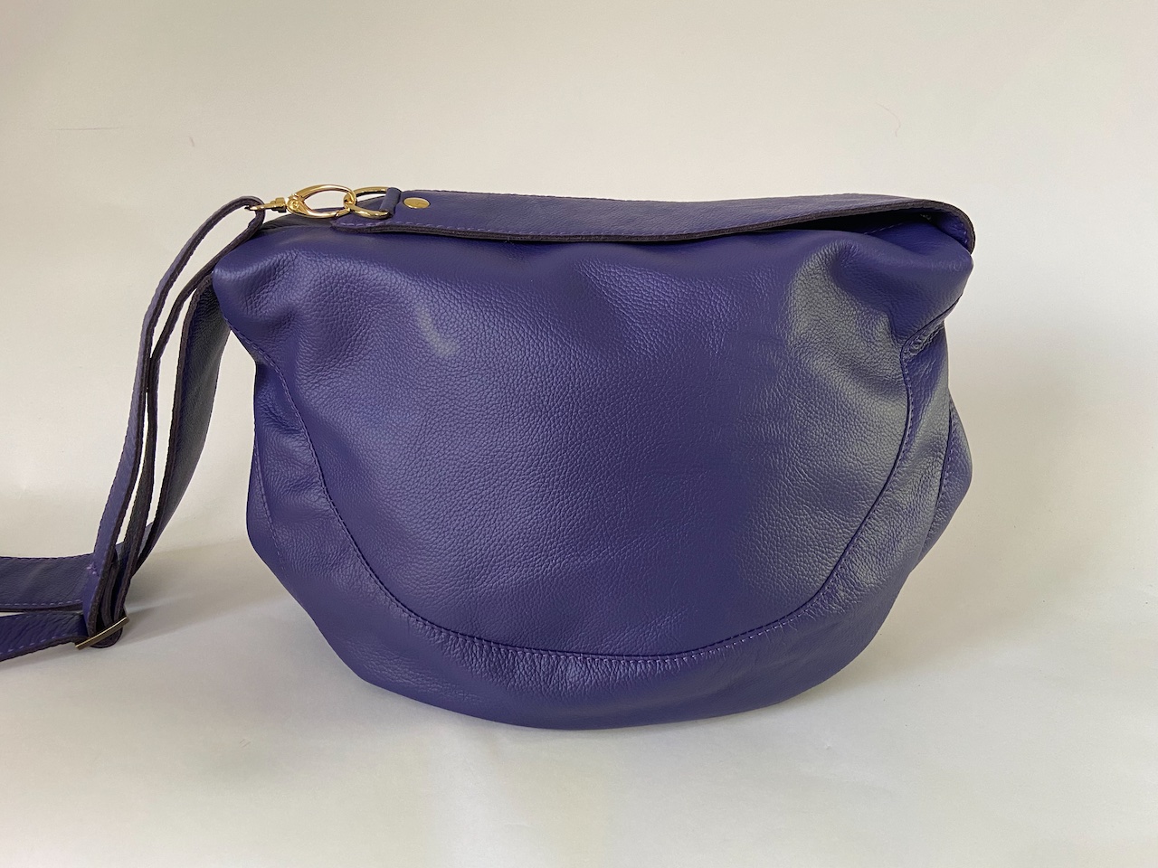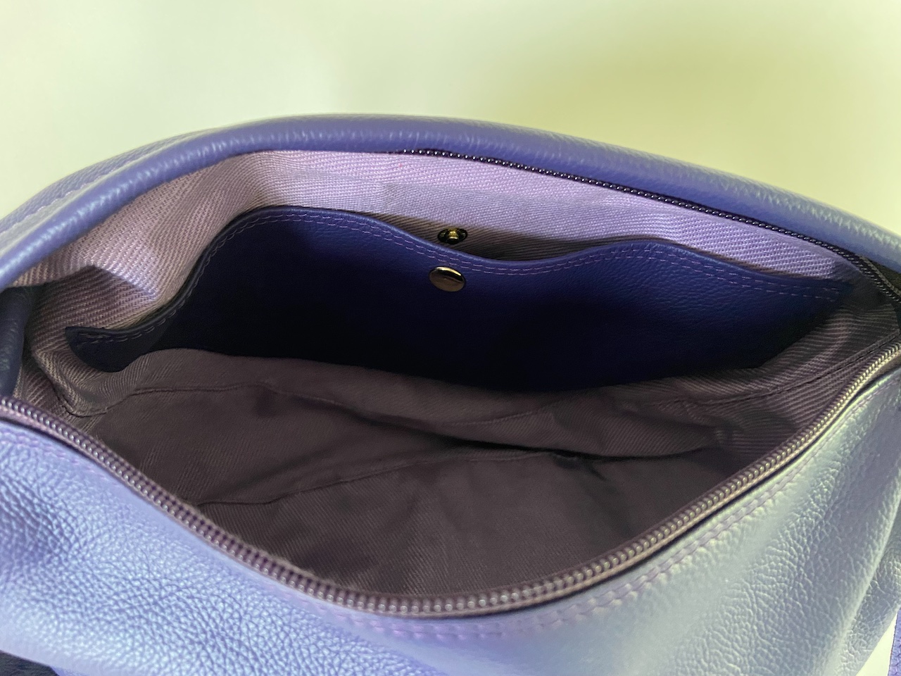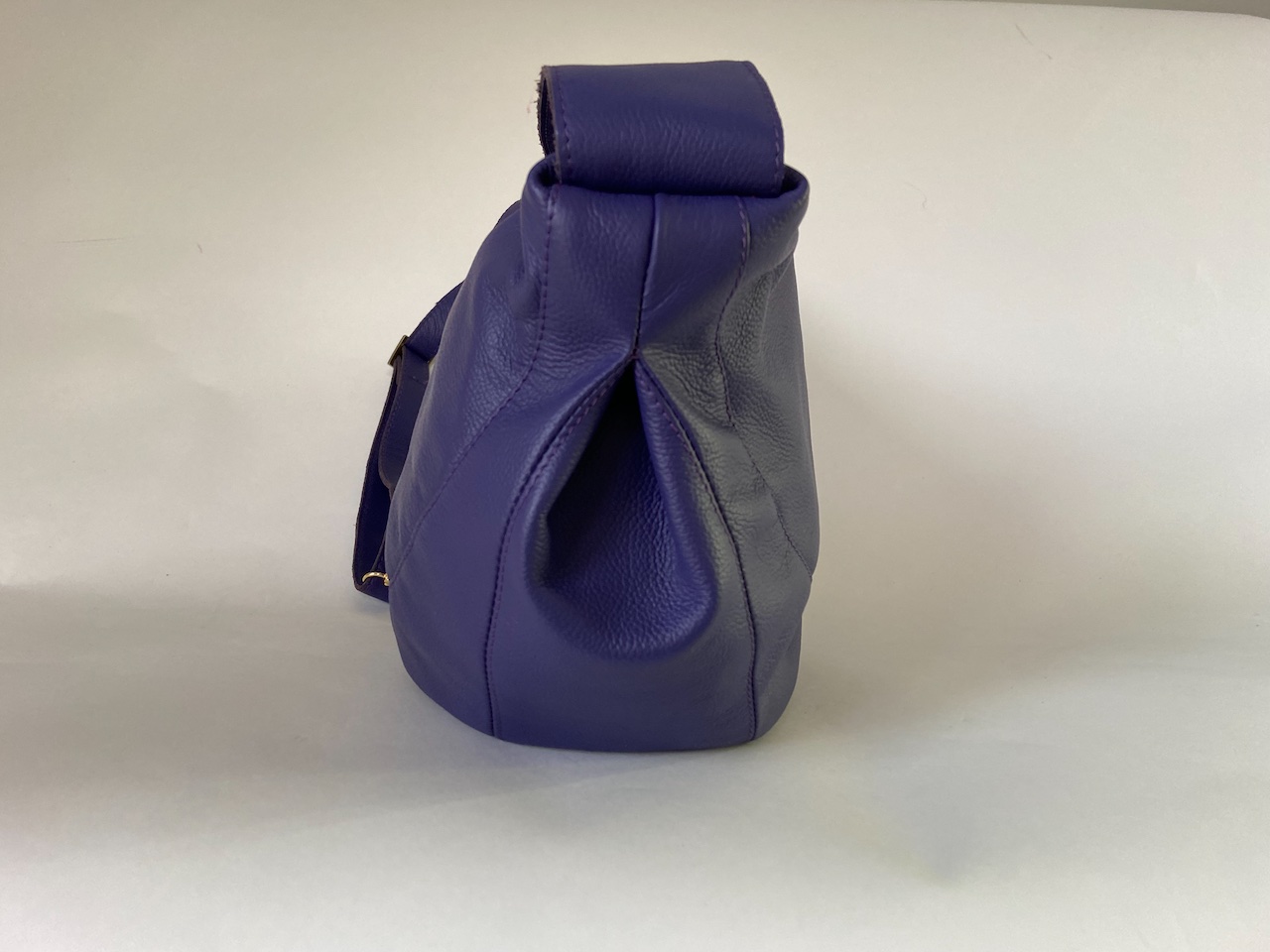 LuPéLo (bolle) schoudertas, gemaakt van paars leer. De tas is gevoerd en heeft 2 opbergvakken in de tas en sluit met een rits. De lengte van de schouderband is op lengte in te stellen.