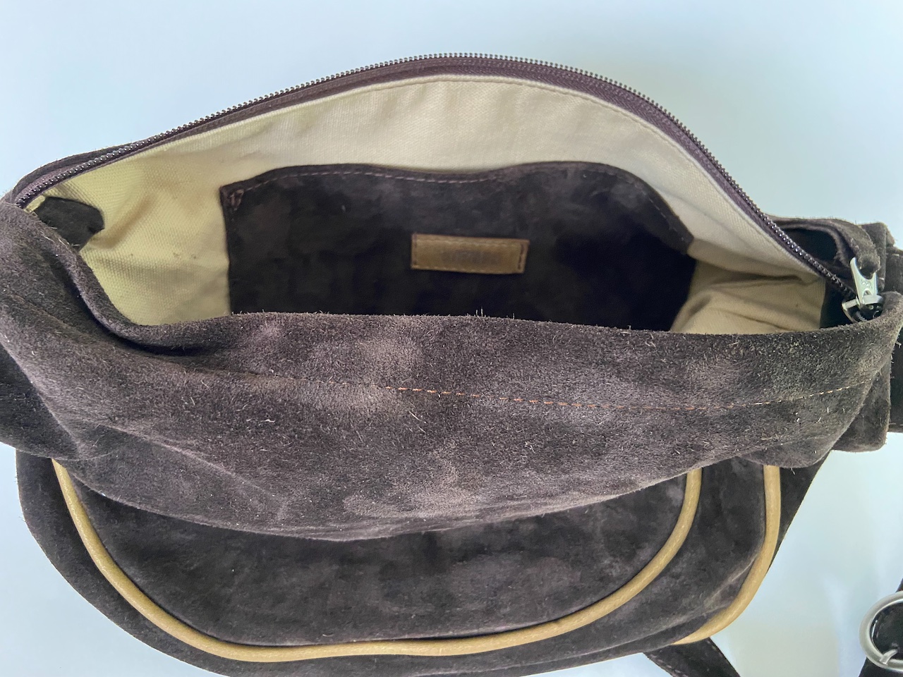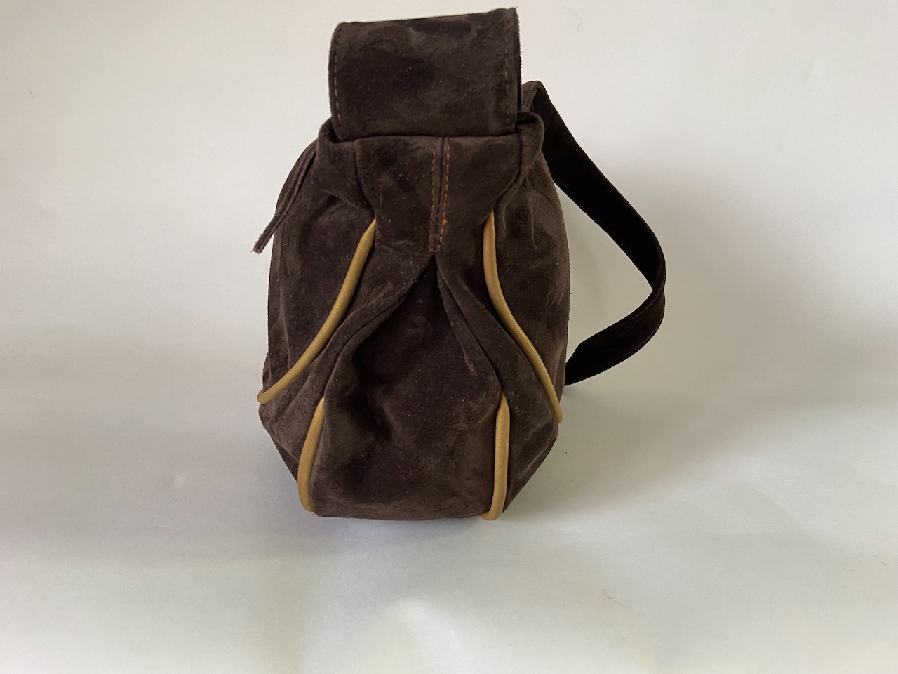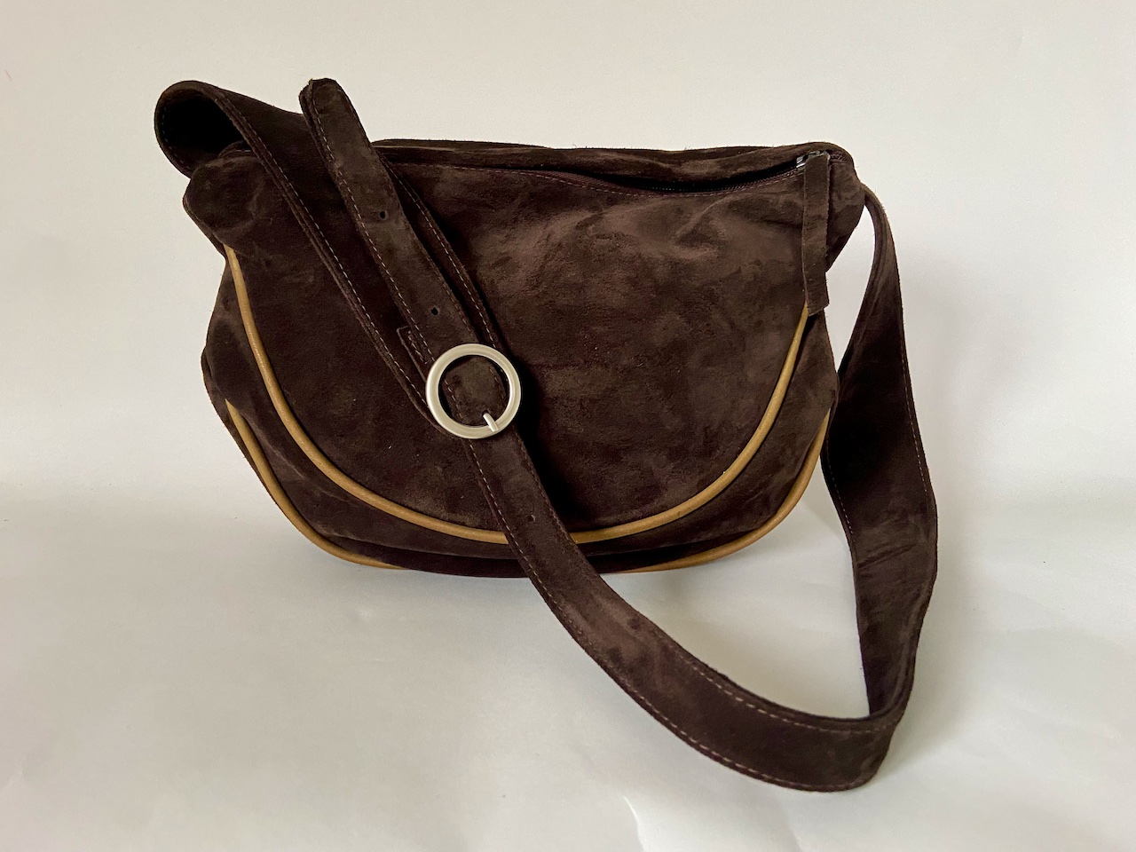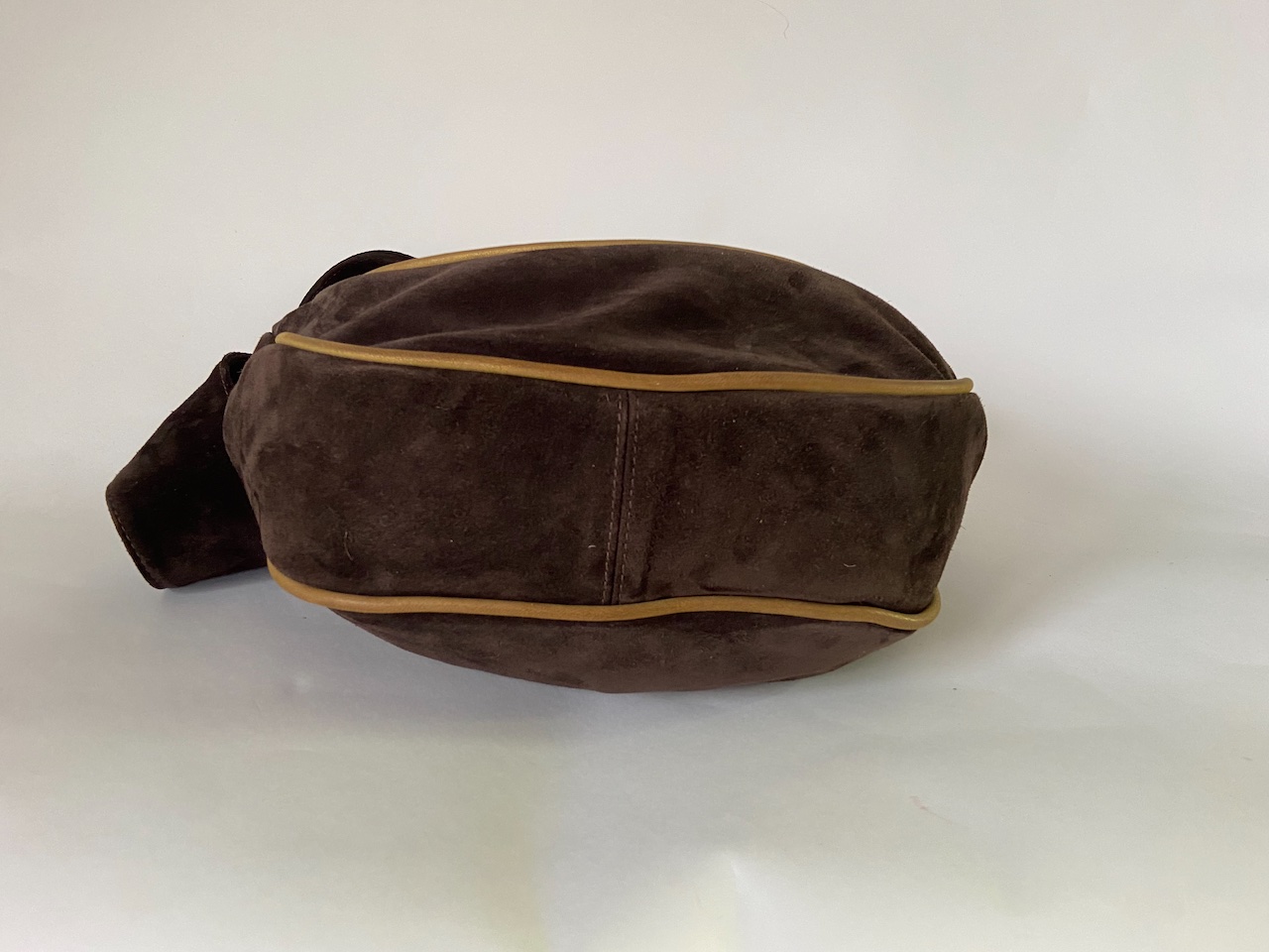 LuPéLo (bolle) schoudertas, gemaakt van donkerbruin soepel suède. De tas is gevoerd en heeft 2 opbergvakken in de tas en sluit met een rits. De lengte van de schouderband is op lengte in te stellen middels een gesp.