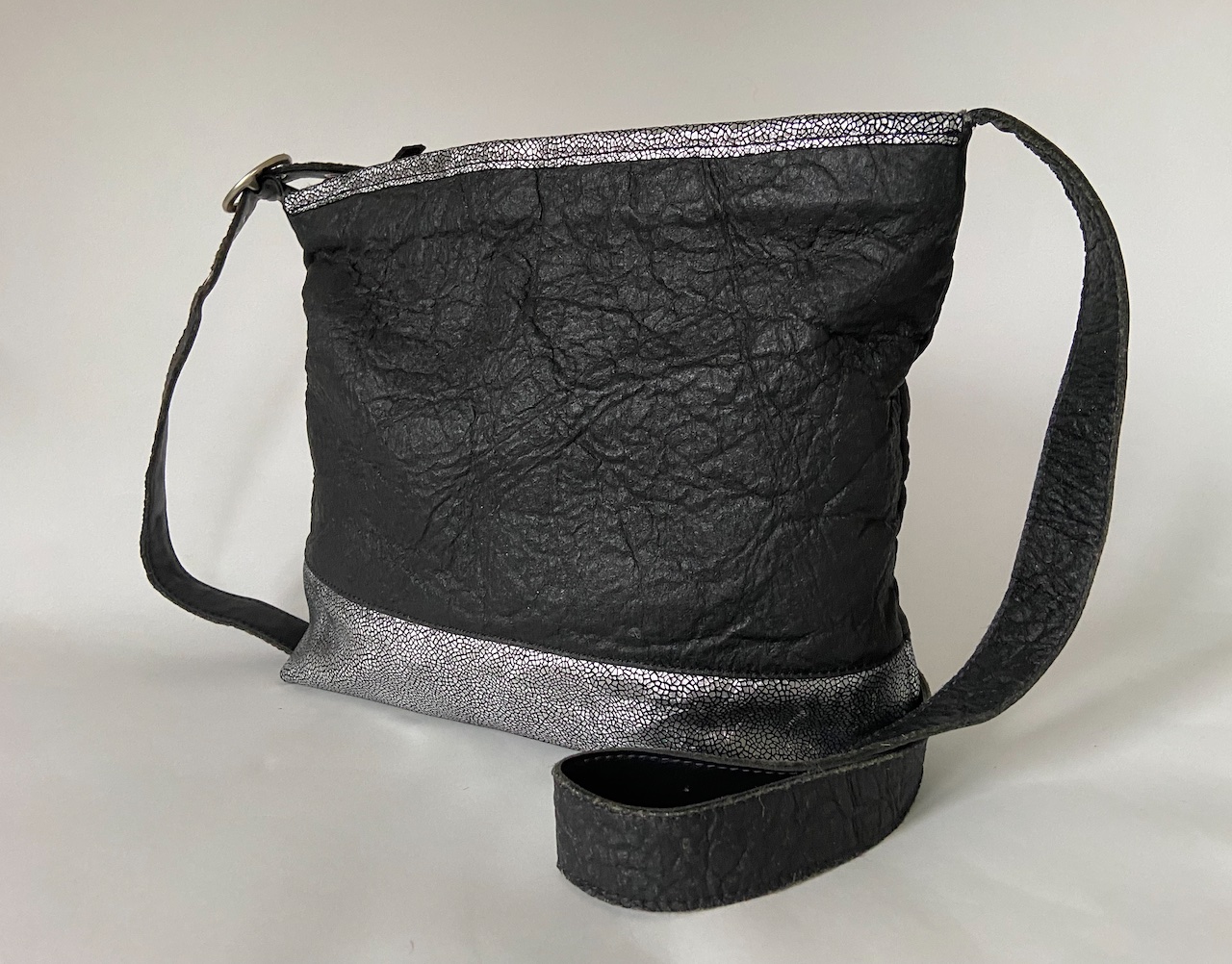 LuPéLo schoudertas, gemaakt van Piñatex, in combinatie met een zilverprint leer en gevoerd met wollen voering. De tas sluit met en rits en heeft een ritsbinnenvak. Piñatex is het alternatief voor leer en is gemaakt van de vezel van het ananasblad.