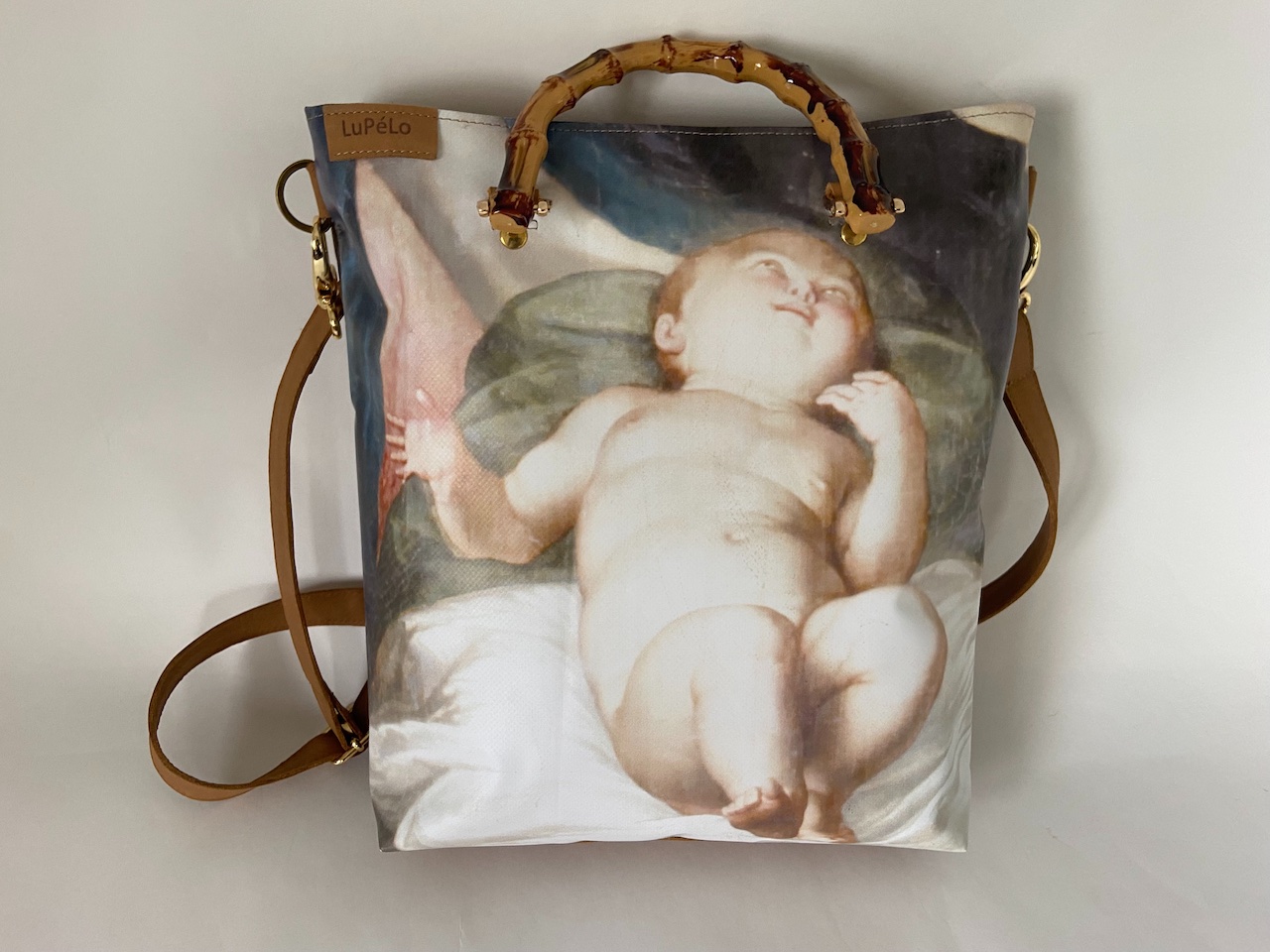 LuPéLo hand/schoudertas, gemaakt van een gebruikte banier van de Lochemse Bachvereniging. Ik voerde de tas met een gebruikte sloop van een kussen. De tas heeft 2 binnenvakken.