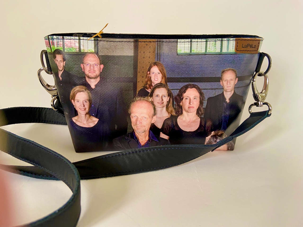 LuPéLo schoudertasje, gemaakt van een gebruikte banier van de Bachvereniging in Lochem. Het tasje draagt de beeltenis van vocaal ensemble MUSA. Het tasje is gevoerd, sluit met een rits, is gevoerd en heeft een rood leren opbergvakje in de tas. Het tasje heeft een leren schouderband die op lengte is in te stellen.