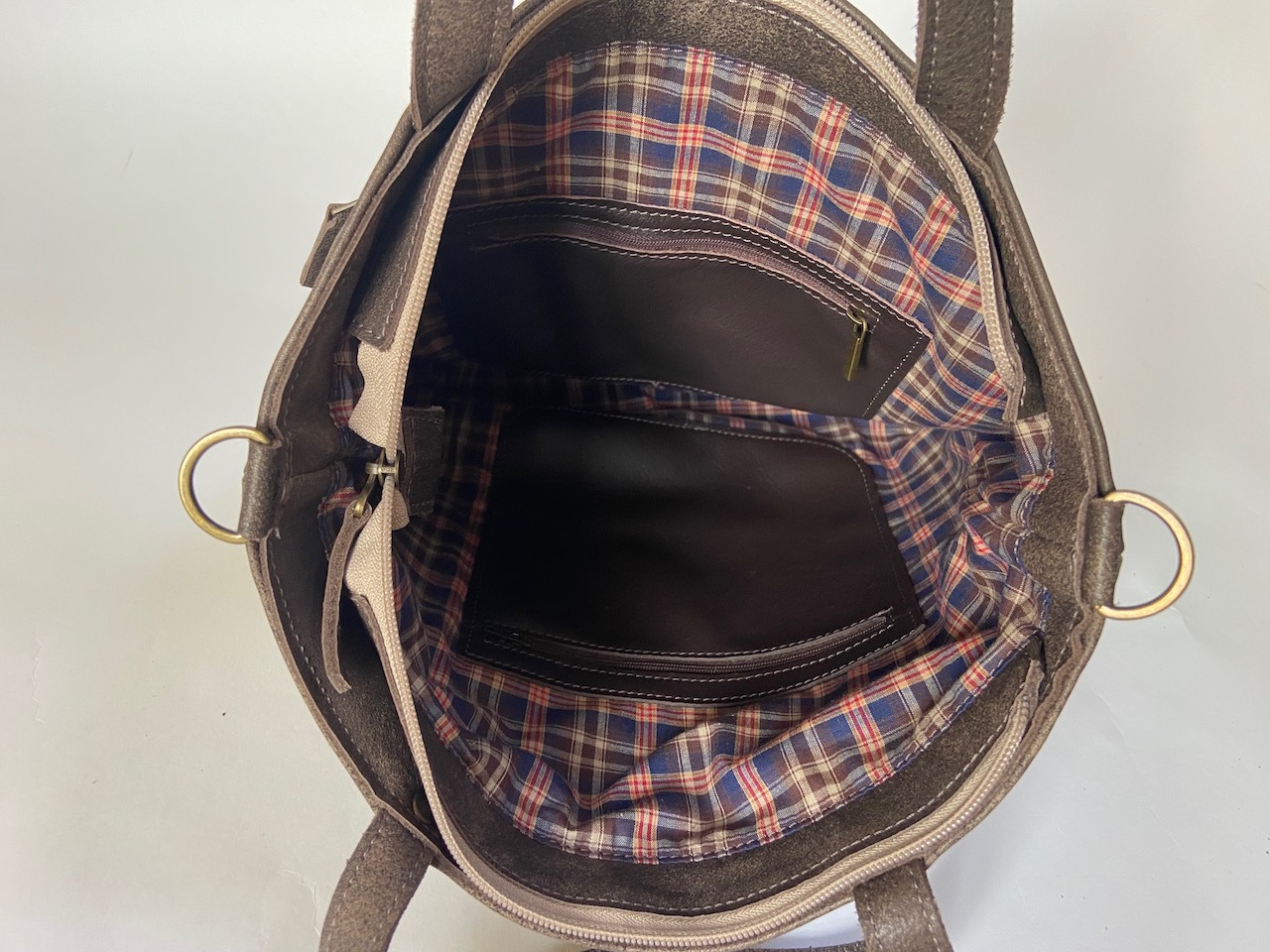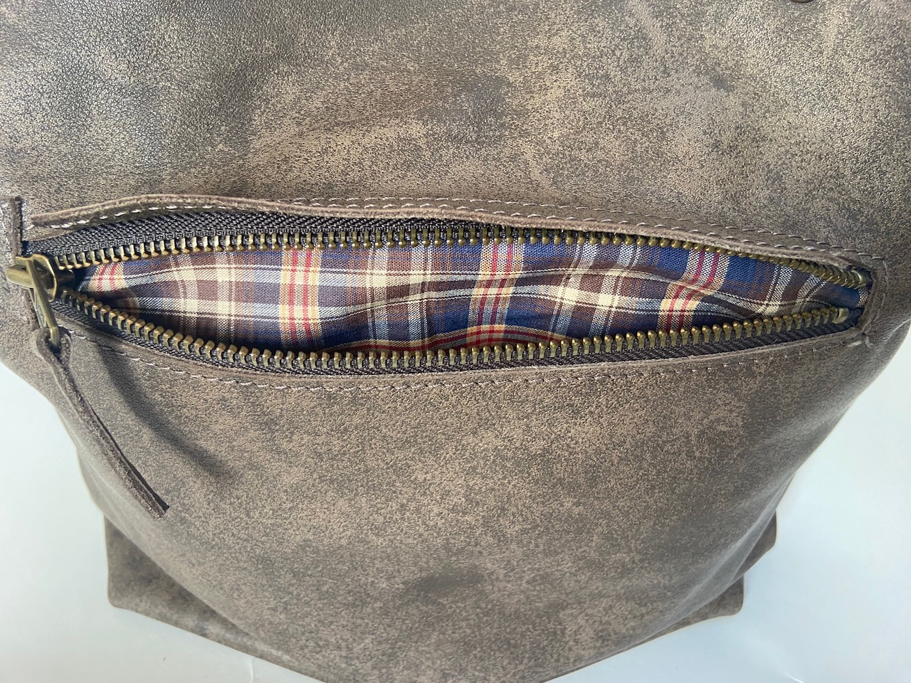 LuPéLo hand/schoudertas, gemaakt van een deel van een gebruikte postzak uit 1988, in combinatie met (soepel) leer dat ik redde uit de afvalbak van de leerlooierij. De tas voerde ik met een bijpassende katoenen ruit. De tas sluit met een rits van 20 cm, heeft een ritsvak aan de buitenkant van de tas en 2 ritsopbergvakken in de tas. De tas heeft een 2 korte handvatten en een (afneembare) schouderband die op lengte is te verstellen.