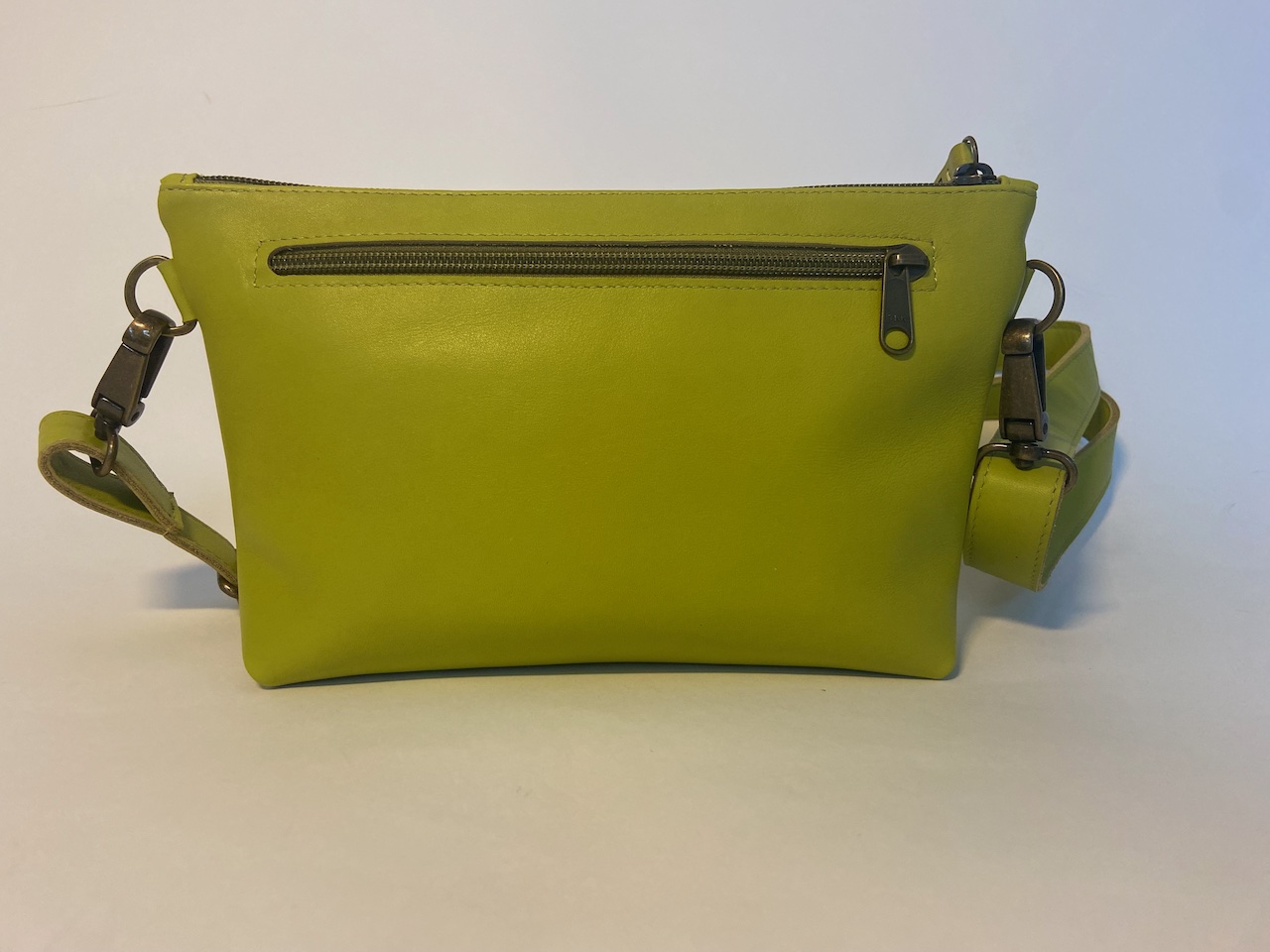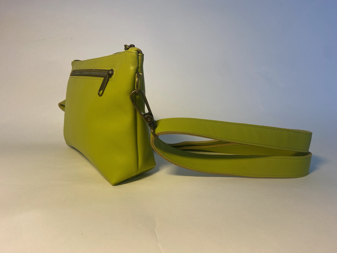LuPéLo schoudertasje, in limoenkleurig kalfsleer. De tas sluit met en rits en heeft een rits opbergvak aan de buitenkant. De tas is gevoerd met glanzende (in een moiré patroon) tassenvoering. Het hengsel (2,5 cm. breed) is op lengte in te stellen. In de tas zit een vouwportemonneetje van hetzelfde leer.